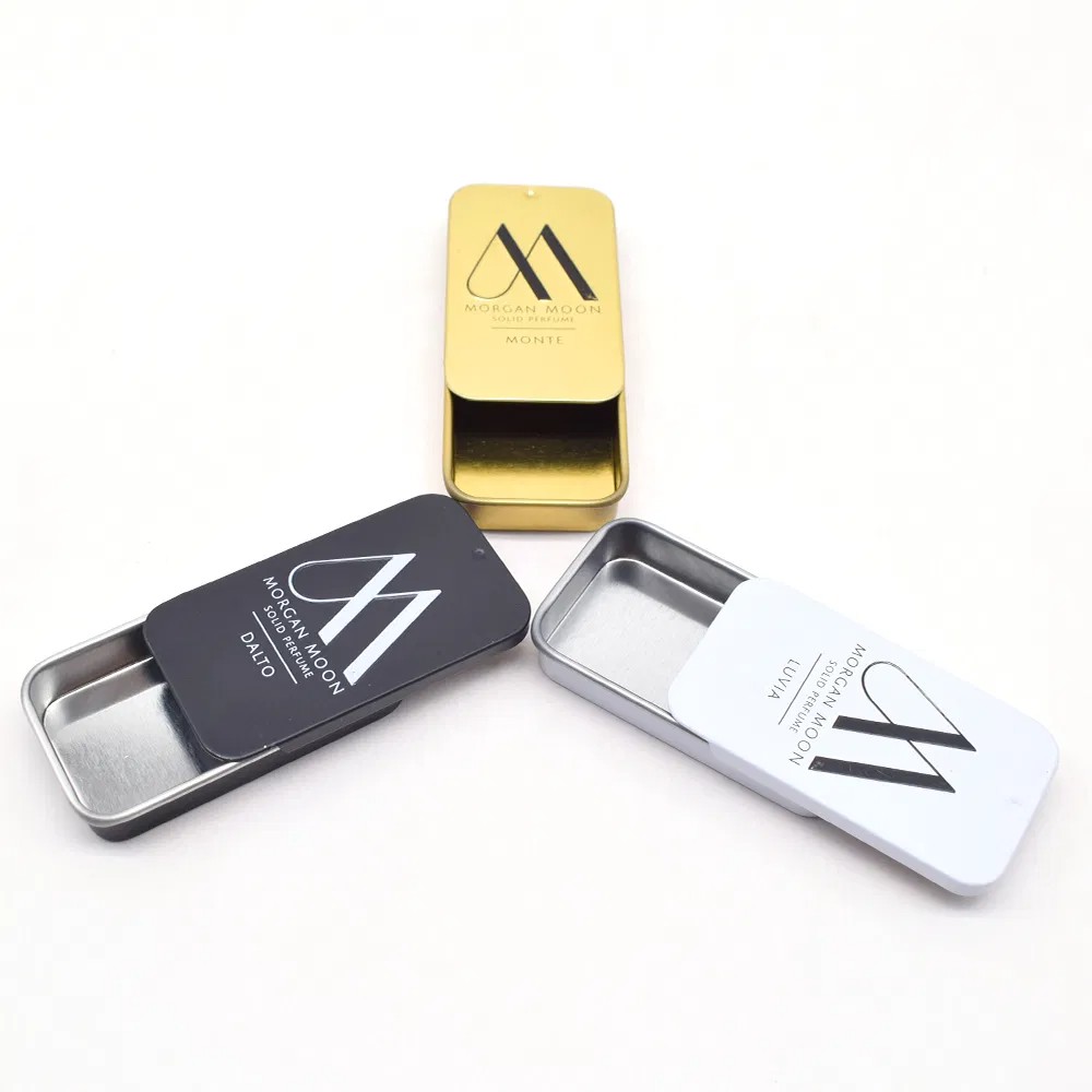 Custom Embossed Logo Printing Gold White Black Emboss Solid Natural Perfume Container Lip Balm Mint Rectangle Sliding Lid Tin